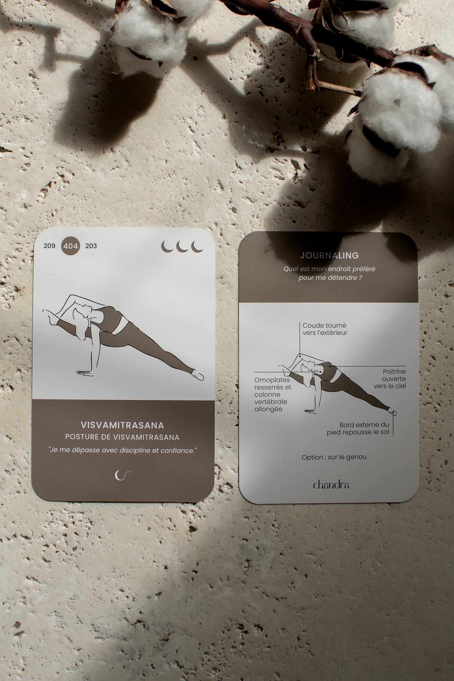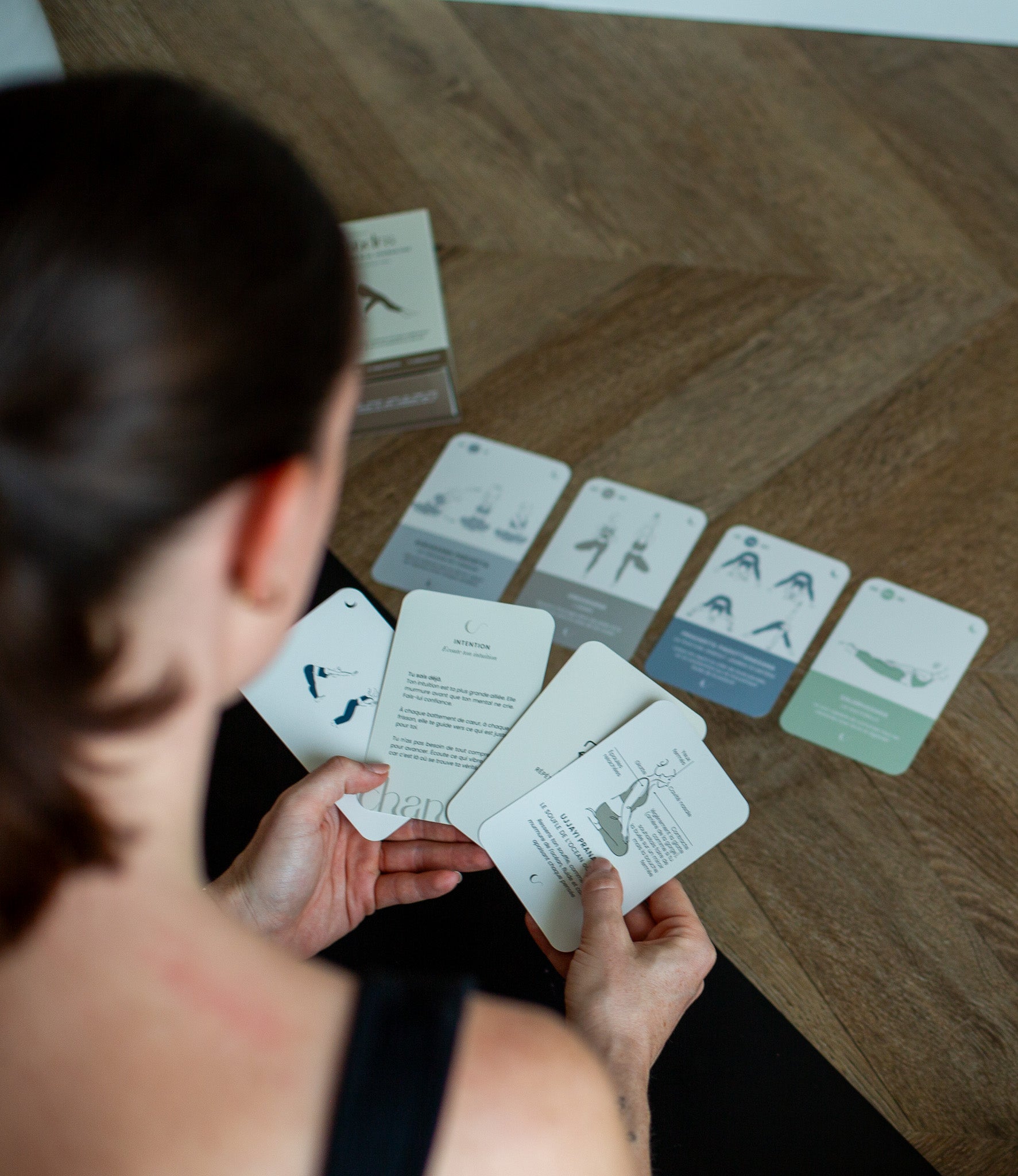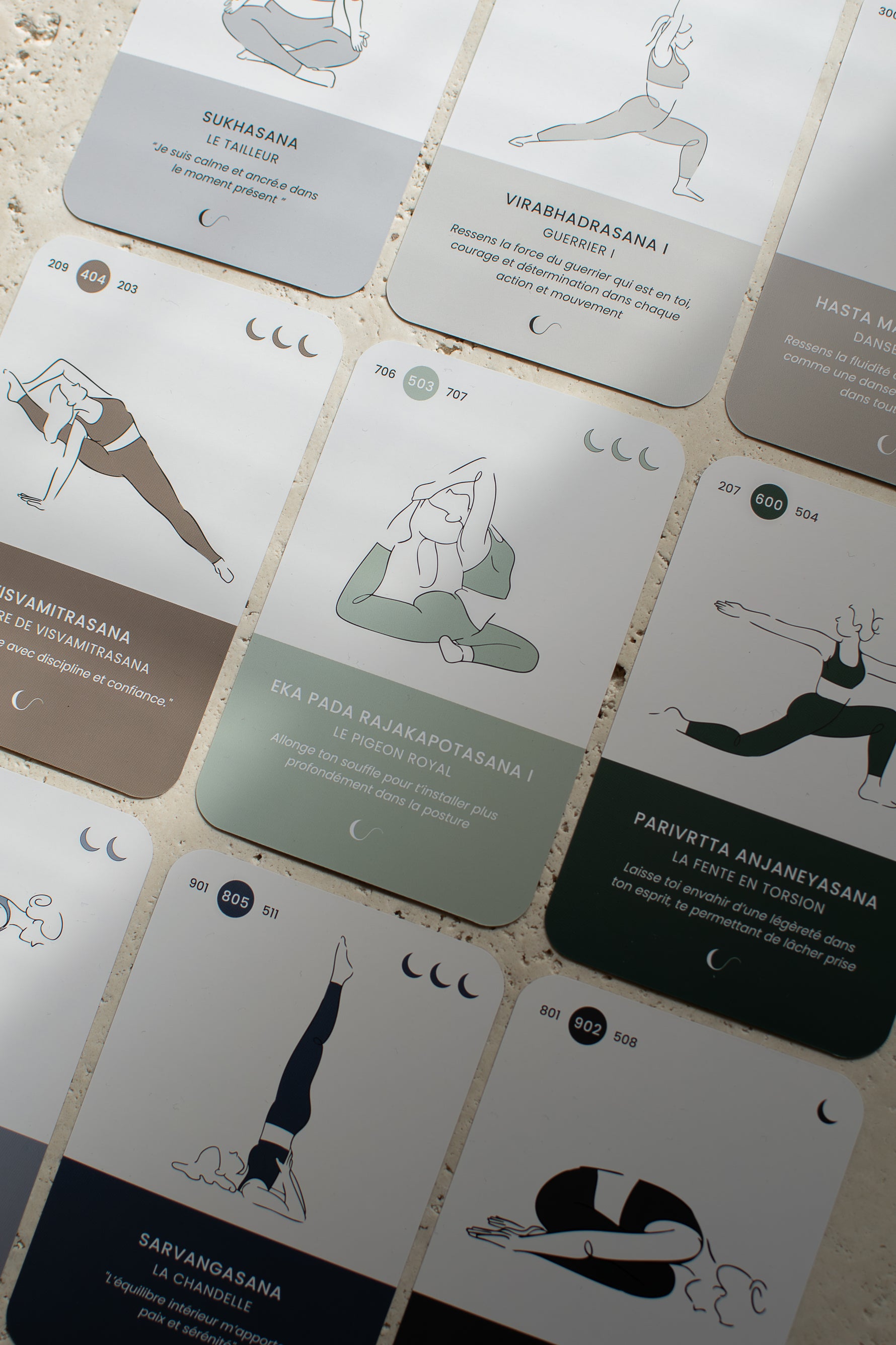 Une carte, une posture, un instant. Votre mental se pose, votre attention revient au corps. Pas de scroll, pas de distraction. Juste vous et votre pratique, ancrée dans l'instant présent.